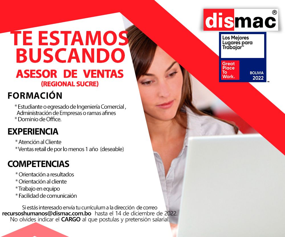 En Dismac, creemos en el talento boliviano y en las oportunidades que transforman vidas. Si eres una persona entusiasta, comprometida y con ganas de crecer, este es tu momento. Ofrecemos un ambiente dinámico, capacitación constante y la posibilidad de desarrollarte en una de las empresas líderes del país. No importa si no tienes experiencia previa; lo que valoramos es tu actitud, tu energía y tu deseo de aprender. ¡Forma parte de nuestro equipo y descubre todo lo que puedes lograr con Dismac! Tu carrera profesional comienza aquí.
